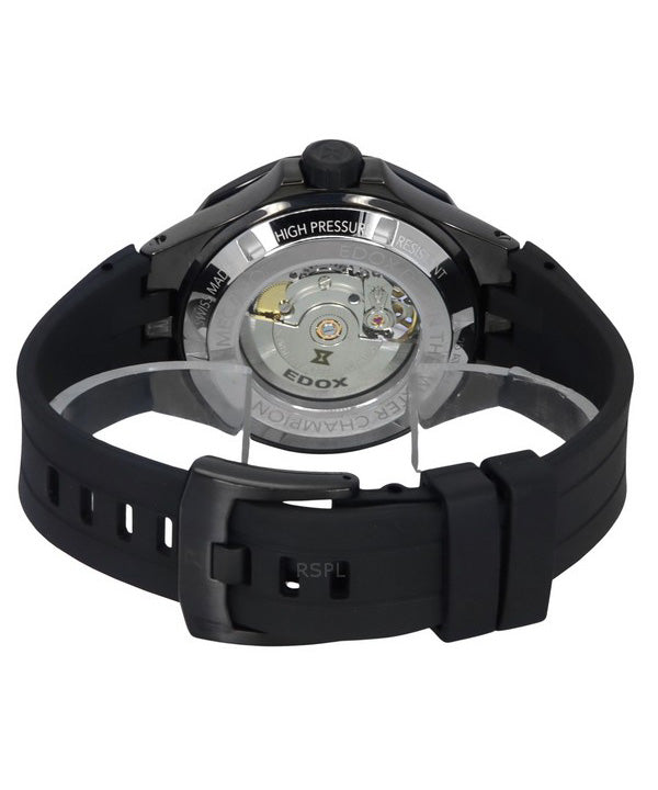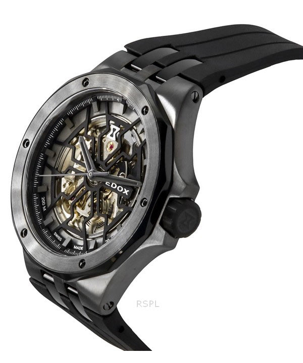 Edox Delfin The Original Mecano Rubber Strap Skeleton Black Dial Automatic Diver's 85303 357GN NGN 200M Men's Watch